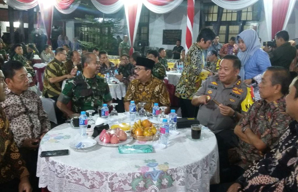 Alhamdulillah, pada hari ini kita bisa berkumpul di rumah dinas Pangdam. Semoga kita diberi sehat dalam meyongsong Pam Pemilu, berkumpul menyatukan persepsi dan langkah untuk mengamankan jalannya pemilu 2019. Atas binaan Gubernur Pak de Sukarwo sinergitas TNI Polri dan Forpimda berjalan dengan baik mengawal keamanan di Jatim,” ujar Kapolda Jatim dalam sambutannya.