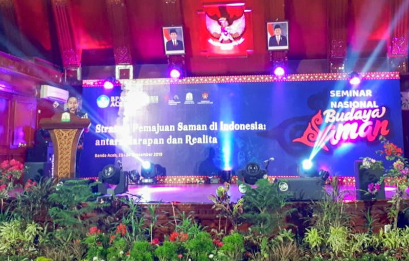 BANDA ACEH, ACEH, BN-Kadis Kebudayaan dan Pariwisata Aceh, Jamaludin SE resmi membuka seminar Budaya Saman 2019 di Anjong Mon Mata Banda Aceh, Senin (23/9/2019).