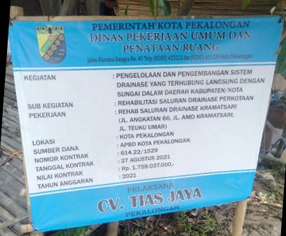 PEKALONGAN, bidiknasional.com – Pekerjaan rehab saluran drainase Kramatsari di Jl.Angkatan 66, Jl.AMD Kramatsari dan Jl.Teuku umar Pekalongan Barat, Sumber Dana APBD Kota Pekalongan Tahun 2021, Nomor kontrak : 614.22/1529, Tanggal kontrak 27 Agustus 2021, Pelaksana CV.Tias Jaya, dengan nilai kontrak Rp.1.759.037.000,- terkesan asal jadi.