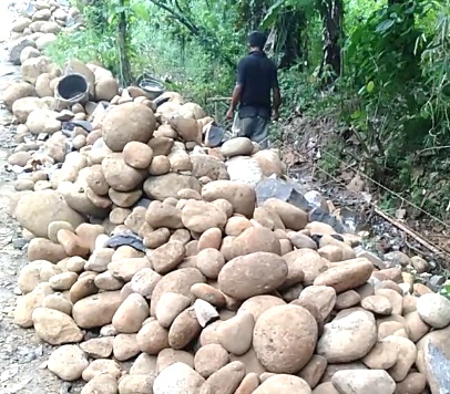 Disinggung lagi terkait penggunaan batu blondos yang terpasang, kades dengan gamblang menjelaskan,” memang harusnya pecah semua ,berhubung cari batu belah sulit jadi memakai batu yang itu,” Ujarnya. (Dikin)