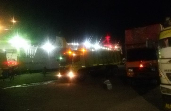 Hingar bingar truk-truk barang yang menumpang kapal Roro Dharma Kartika IX milik armada pelayaran nasional PT.Dharma Lautan Utama (DLU) di Surabaya tersebut tak putus-putusnya terus berdatangan pada Rabu malam (21/03) hingga antrean masuk kapal ferry.