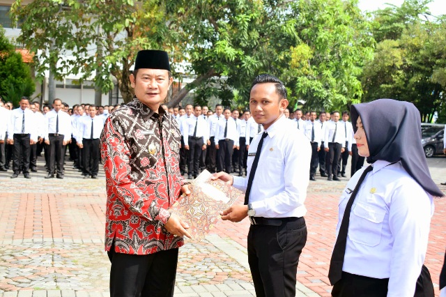 Apel dalam rangka penyerahan keputusan pengangkatan Pegawai Pemerintah dengan Perjanjian Kerja tenaga kesehatan digelar di halaman gedung Pemkab Lamongan. (Foto.dok: Bang IPUL / Tian)