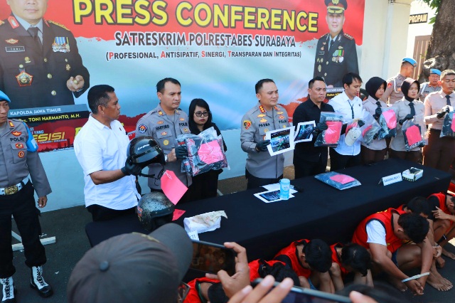 Press Realese Polrestabes Surabaya, Sembilan pelaku diamankan terdiri dari empat orang warga Kabupaten Sidoarjo dan lima orang warga Surabaya (Foto: Humas)
