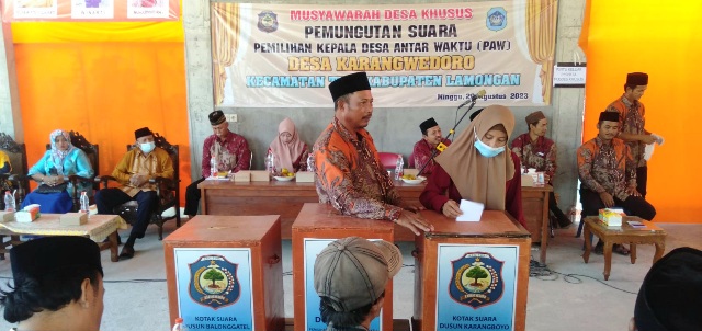 LAMONGAN, BIDIKNASIONAL.com – Pemilihan Kepala Desa (Pilkades) Pergantian Antar Waktu (PAW) tahun 2023 dari 7 desa di 5 Kecamatan di Kabupaten Lamongan, Jawa Timur sukses, berlangsung aman hingga penghitungan suara berakhir. Seperti halnya di Desa Karangwedoro, Kecamatan Turi, Kabupaten Lamongan.