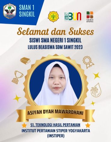Wartawan BN.com konfirmasi Kepsek SMA Negri 1 Singkil Fauzan Karni, S.Pd (23/8-2023) melalui telepon seluler mengatakan dengan singkat, betul satu (1) orang siswi SMA Negri 1 Singkil Asiyah Dyah Mawardhani mendapatkan beasiswa SDM Sawit tahun 2023.