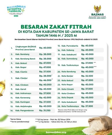 Dalam siaran persnya, berdasarkan Surat Edaran Baznas nomor 092/BAZNAS-JABAR/II/2025, besaran zakat fitrah di Jawa Barat sebagai berikut: