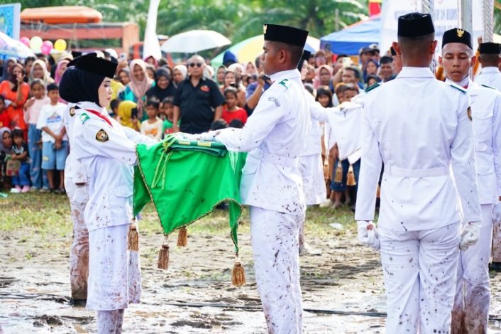 Selain kemeriahan tersebut, ada sesuatu yang menarik terlihat dilokasi, Walaupun berjibaku dengan kotornya percikan lumpur, para pasukan pengibar bendera dibawah komando Mayor Inf. Johanes tetap menyelesaikan tugas yang di pundaknya.