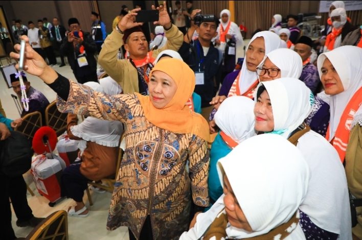 Gubernur Khofifah selfie bersama para jamaah kloter pertama yang akan berangkat haji (foto: istimewa)