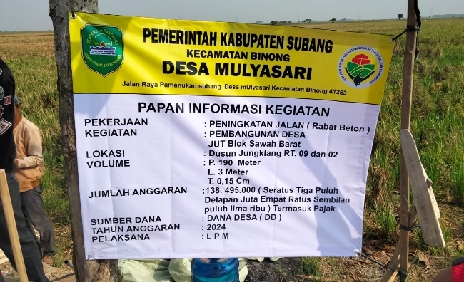 SUBANG, BIDIKNASIONAL.com – Pemerintah Desa Mulyasari, Kecamatan Binong, Kabupaten Subang, Jawa Barat, terus mendorong pembangunan infrastruktur dasar desa melalui pemanfaatan Anggaran Pendapatan dan Belanja Desa (APBDes) Tahun 2024. Salah satu program prioritas tahun ini adalah pembangunan jalan usaha tani di wilayah Dusun Jungklang RT 09 dan RT 02, tepatnya di JUT Blok Sawah Barat.