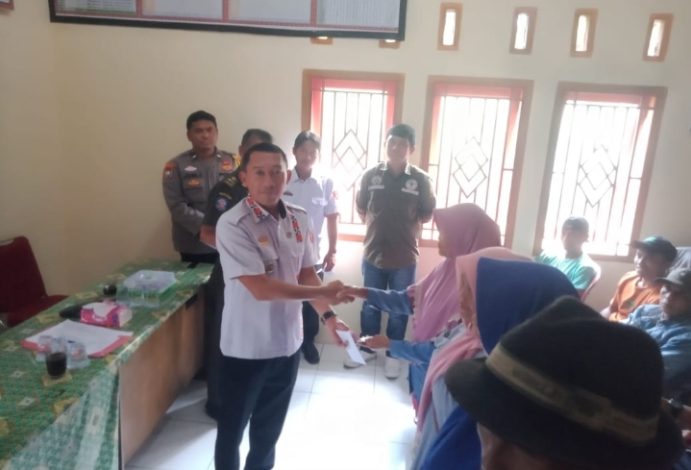 Camat Lumbok Seminung, Erwin Ardiansyah Adiguna didampingi Pj.Peratin Lumbok Selatan, Selamat Mulyadi, Babinsa dan Bhabinkamtibmas serta Ketua LHP dan pendamping Desa menyerahkan BLT DD kepada perwakilan KPM di Pekon Lumbok Selatan, Rabu 14/5/2025 (Foto: Taufik bn Lambar)