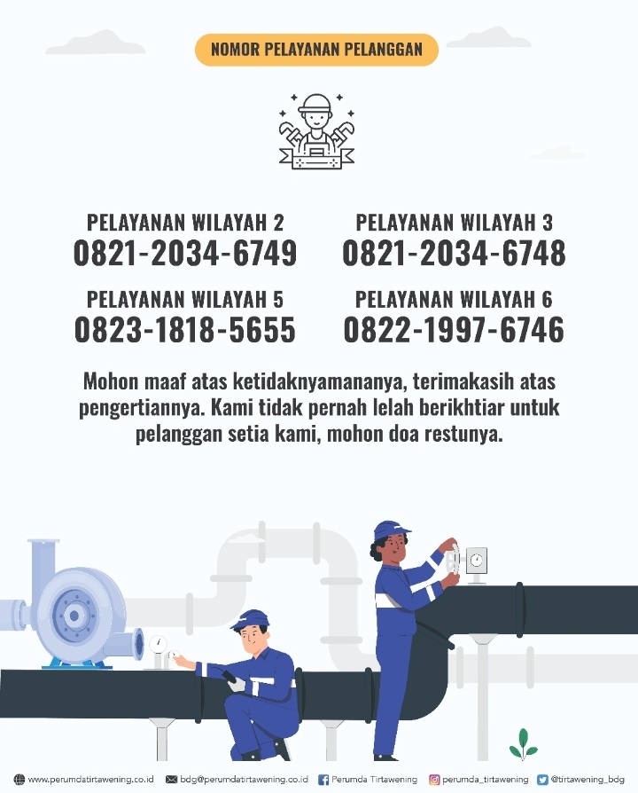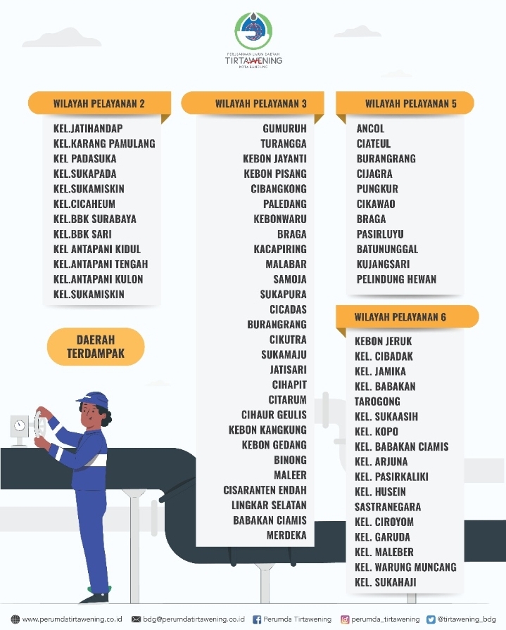 Perumda Tirtawening Kota Bandung menginformasikan untuk Wilayah Pelayanan yang terkena dampak dan nomor kontak yang dapat dihubungi lebih lanjut :