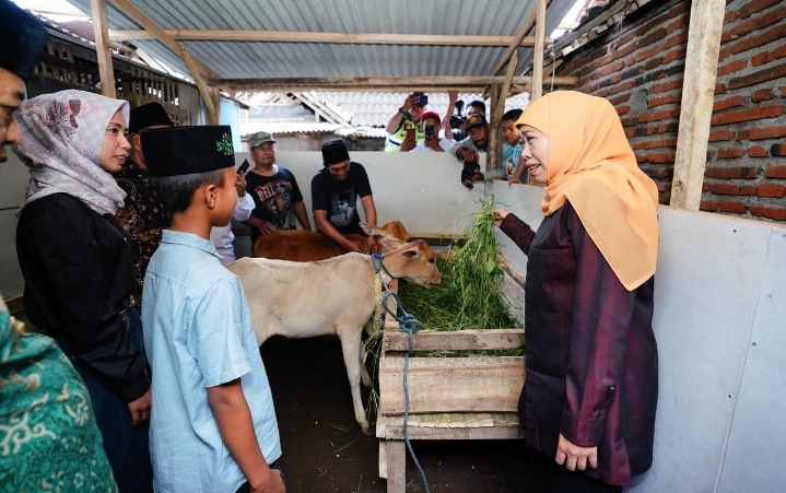 “Alhamdulillah diizinkan, maka kemarin kita bikinkan kandang dan dikirim dua ekor sapi dengan nama Sri dan Jeki dari kata Sri Rejeki,” ungkap Khofifah.