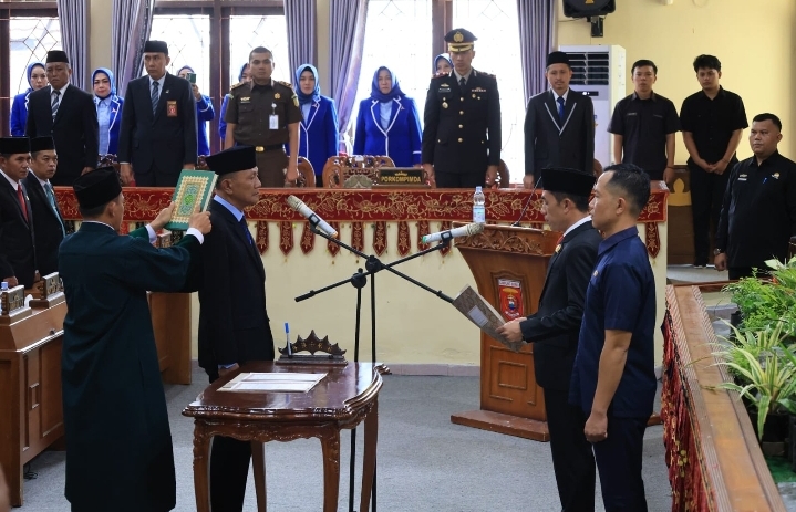 Ketua DPRD Lampung Barat, Edi Novial melantik dan mengambil sumpah jabatan Edi Gunawan sebagai anggota DPRD dalam Rapat Paripurna DPRD dengan agenda pelantikan PAW anggota DPRD Lampung Barat, Senin 26/5/2025 (Foto: doc.Diskominfo/Taufik BN Lambar)