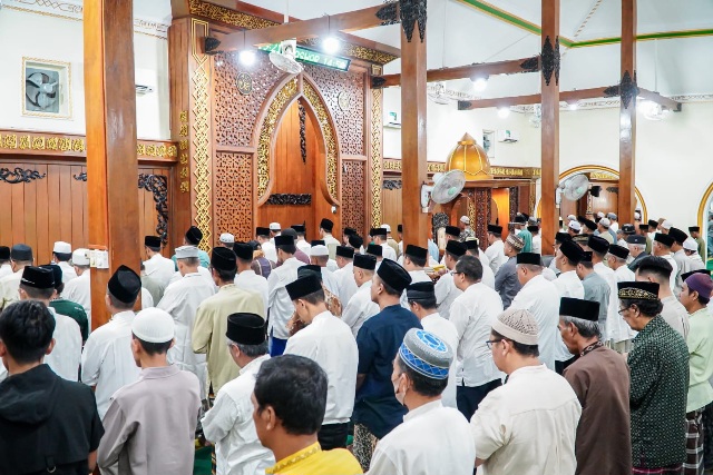 Menjelang puncak Hari Jadi Lamongan (HJL) ke-456 tahun 2025, Pemkab, jajaran Forkopimda serta masyarakat menunaikan ibadah sujud syukur, sholat hajat, dan tasyakuran, di Masjid Agung Lamongan, Minggu malam (Foto: ist)