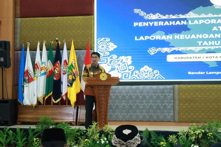 Kepala BPK RI Perwakilan Provinsi Lampung, Nugroho Heru Wibowo, dalam sambutannya memberikan apresiasi kepada seluruh pemerintah daerah di Provinsi Lampung yang telah menyelesaikan laporan keuangannya secara tepat waktu dan sesuai dengan Standar Akuntansi Pemerintahan (SAP).