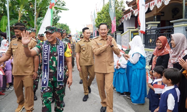 Bupati Lamongan Yuhronur Efendi mendampingi Waster Panglima TNI Brigjen (Mar) Bambang Hadi Suseno saat meninjau progres program TNI manunggal membangun desa (TMMD)/ Foto: ist