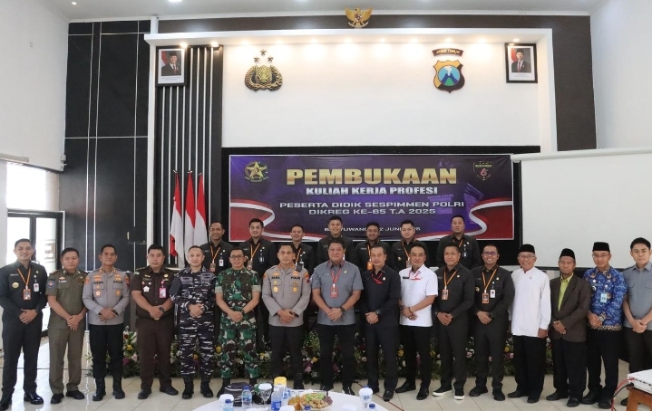 BANYUWANGI, BIDIKNASIONAL.com – Polresta Banyuwangi menerima kunjungan peserta didik Sekolah Staf dan Pimpinan Menengah (Sespimmen) Polri Dikreg ke-65 Gelombang I Tahun Anggaran 2025 dalam rangka pelaksanaan Kuliah Kerja Profesi (KKP), Senin (2/6/2025).