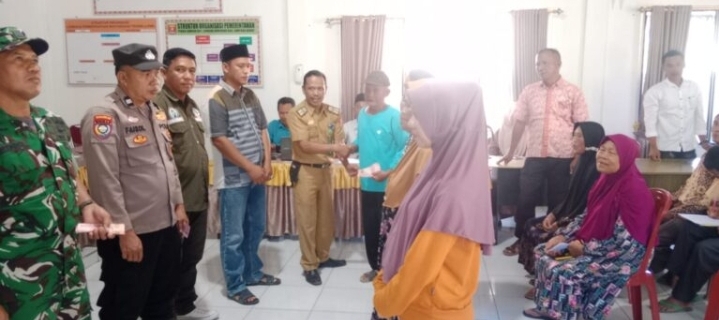 Pj. Peratin Lumbok Induk, Ari Darmanto dengan di dampingi Ketua LHP, Pendamping Desa, Babinsa dan Bhabinkamtibmas Pekon setempat menyerahkan BLT DD Tahap 1 pada salah seorang warga masyarakat yang masuk dalam kategori Kelompok Penerima Manfaat (KPM), Selasa 3/6/2025. Foto: Taufik BN Lambar