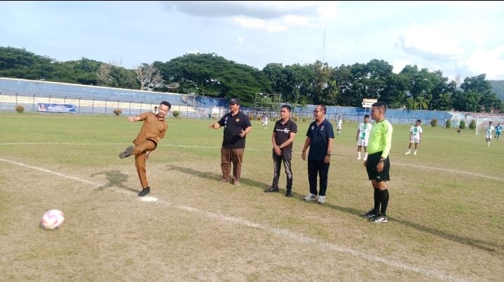 Plt Kadispora Kabupaten Labuhanbatu M. Anugerah Perdana Rambe S. STP saat membuka Kompetisi Soeratin di lapangan stadion binaraga (Foto: M.Sukma BN Labuhanbatu)