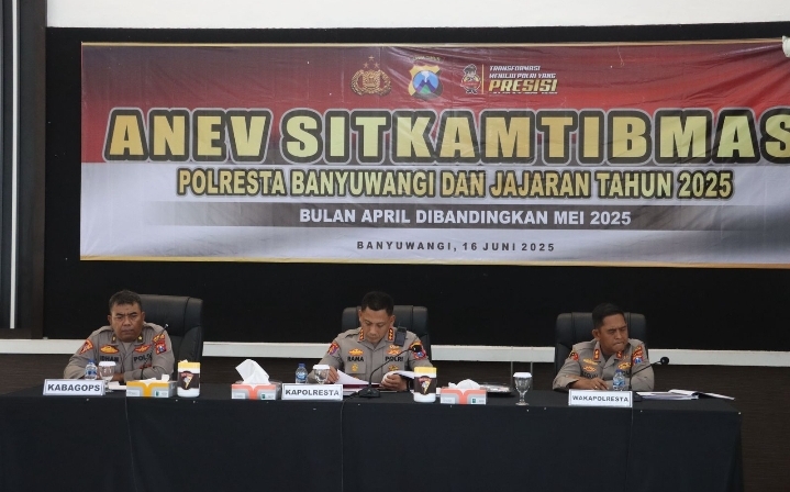 BANYUWANGI, BIDIKNASIONAL.com – Polresta Banyuwangi terus berbenah. Untuk memastikan layanan kepada masyarakat berjalan optimal, seluruh jajaran menggelar Anev Kamtibmas di Rupatama Wirapratama Polresta Banyuwangi , Senin (16/6/2025).