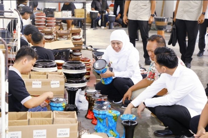 BLITAR, BIDIKNASIONAL.com – Gubernur Jawa Timur Khofifah Indar Parawansa bersama Wakil Presiden Republik Indonesia Gibran Rakabuming menyambangi UMKM Budi Luhur produsen kendang jimbe dan rebana berkualitas ekspor di Desa Sentul Kecamatan Kepanjen Kidul, Kota Blitar, Rabu (18/6).