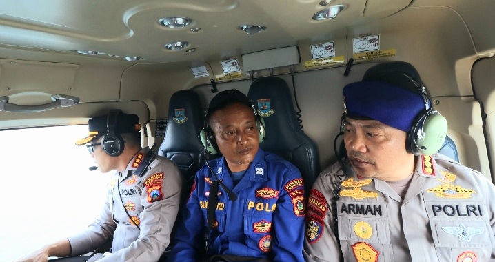 Kapolresta Banyuwangi Kombes Pol Rama Samtama Putra,S.I.K., M.Si., M.H., Dirpolairud Polda Jatim Kombea Pol. Arman Asmara Syarifuddin, S.H., S.I.K., M.H., dan Kapolres Jembrana AKBP Kadek Citra Dewi Siparwati, S.H., S.I.K., M.I.K., melakukan pemantauan dari udara menggunakan helikopter di atas perairan Selat Bali.