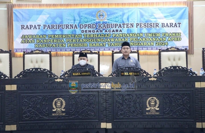 PESISIR BARAT, BIDIKNASIONAL.com – Wakil Bupati Pesisir Barat (Pesibar), Irawan Topani, S.H., M.Kn., menghadiri rapat paripurna Dewan Perwakilan Rakyat Daerah (DPRD) Pesibar dengan agenda jawaban pemerintah atas pandangan umum fraksi-fraksi DPRD terhadap Laporan Pertanggungjawaban (LPJ) Pelaksanaan Anggaran Pendapatan dan Belanja Daerah (APBD) Tahun Anggaran 2024, di ruang rapat paripurna DPRD, Kamis (10/7/2025).