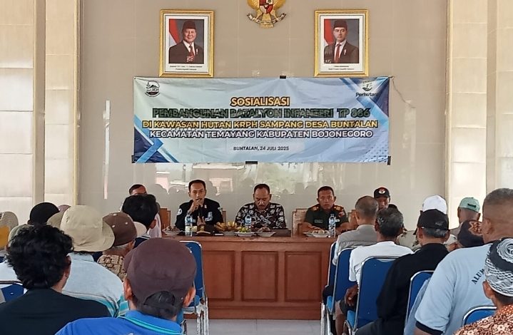 BOJONEGORO, BIDIKNASIONAL.com – Dalam Rangka memperkuat pertahanan negara, Kementerian Pertahanan melalui Perhutani dan Pemerintah Desa (Pemdes) Buntalan Kecamatan Temayang Kabupaten Bojonegoro melakukan sosialisasi pembebasan lahan Perhutani di KRPH Sampang dan BKPH Dander KPH Bojonegoro yang akan digunakan atau dibangun Markas Batalyon pembangunan dan Brigif TP. 34 di kawasan Perhutani yang saat ini dikelola masyarakat sekitar untuk bercocok tanam. Acara diselenggarakan di pendopo Balai Desa Buntalan, Kamis (24/07/2025).