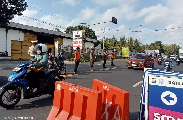 BANYUWANGI, BIDIKNASIONAL.com – Sat Pamobvit Polresta Banyuwangi, BPBD Banyuwangi, Satpol PP Banyuwangi, Sat Lantas Polresta Banyuwangi dan relawan Satgas Bankom RAPI Banyuwangi serta Stakeholder melaksanakan pengamanan dan pengaturan arus lalu-lintas di pertigaan jalan Lingkar SPBU farli Ketapang, Senin 28 Juli 2025.