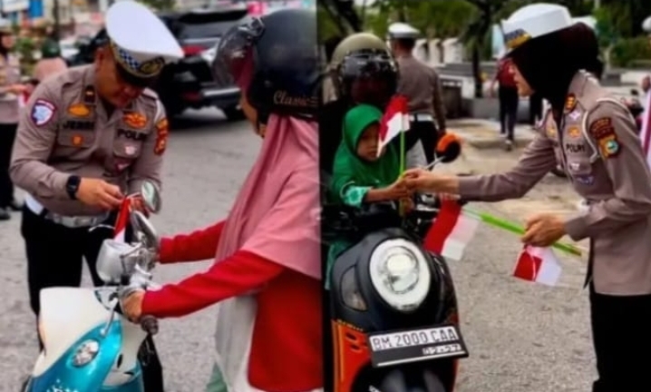 Dengan semangat kemerdekaan, para personel Satlantas Polres Pelalawan menyapa masyarakat untuk memberikan himbauan agar selalu tertib berlalu lintas, sambil membagi-bagikan ratusan bendera merah putih kepada pengendara pada saat melintas.