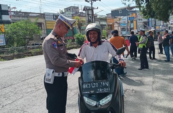 “Pembagian dan pemasangan bendera ini bertujuan untuk membangkitkan semangat nasionalisme dan patriotisme masyarakat, khususnya para pengguna jalan, dalam menyambut HUT RI ke-80,” ujar IPTU P. Sirait.