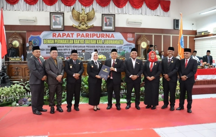 LABUHANBATU, BIDIKNASIONAL.com – Bupati Labuhanbatu dr. Hj. Maya Hasmita, Sp.OG, M.K.M, dan Wakil Bupati Labuhanbatu H. Jamri, ST, mengikuti sidang paripurna pidato kenegaraan Presiden RI Prabowo Subianto pada sidang tahunan MPR- RI dan sidang bersama DPR-RI dan DPD- RI tahun 2025 serta penyampaian keterangan Pemerintah atas rancangan RUU tentang APBN tahun 2026 di ruang paripurna DPRD Kabupaten Labuhanbatu, jalan SM Raja Rantauprapat, Kecamatan Rantau Selatan, Jum’at 15/8/2025.