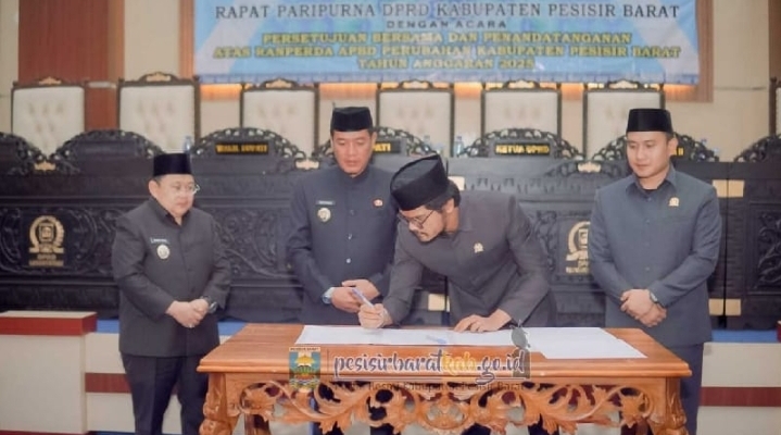 Ketua DPRD M.Emil Lil Ardi dan Bupati, Dedi Irawan disaksikan Wakil Bupati, Irawan Topani dan Wakil Ketua II DPRD, M. Amin Basri menandatangani Dokumen persetujuan Ranperda tentang APBD Perubahan Pesisir Barat Tahun Anggaran 2025. (Foto: doc. Diskominfotiksan Pesibar)
