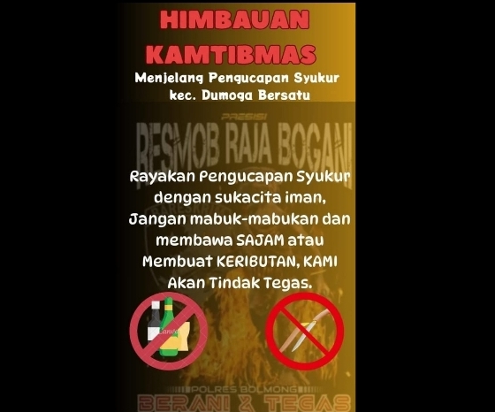 BOLMONG, BIDIKNASIONAL.com – Dalam rangka perayaan pesta rakyat Pengucapan Syukur di wilayah Kecamatan Dumoga Bersatu, Kapolres Bolaang Mongondow AKBP LIDO R ANTORO SH,SIK, MM, mengimbau seluruh masyarakat agar bersama-sama menjaga keamanan dan ketertiban.