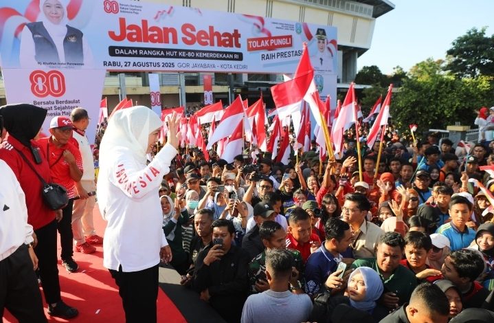 Dengan penuh semangat, Gubernur Khofifah ikut berjalan kaki menyapa puluhan ribu murid dan guru yang antusias mengikuti kegiatan dalam rangka memeriahkan HUT ke-80 Kemerdekaan Republik Indonesia ini. Jalan Sehat kali ini mengambil tema ‘Tolak Pungli, Raih Prestasi’.