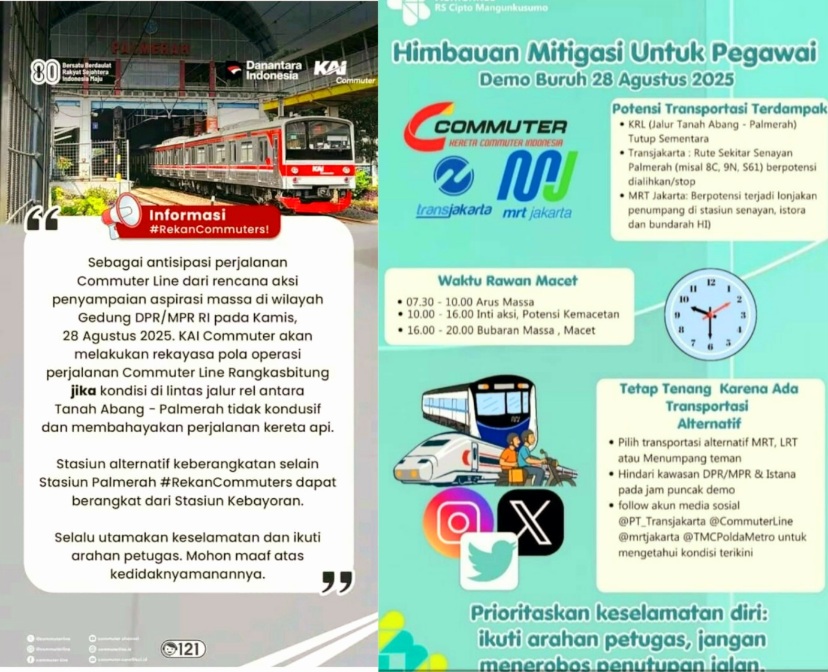 Sementara transportasi arah gedung DPR gatot subroto akan ditutup dan perjalanan kereta api palmerah ke tanah abang dialihkan ke stasiun kebayoran lama untuk antisipasi Demo masal kamis ini juga pelayanan trans jakarta arah gatot subroto ke grogol dialihkan karena penutupan jalan aksi unjuk rasa massal.