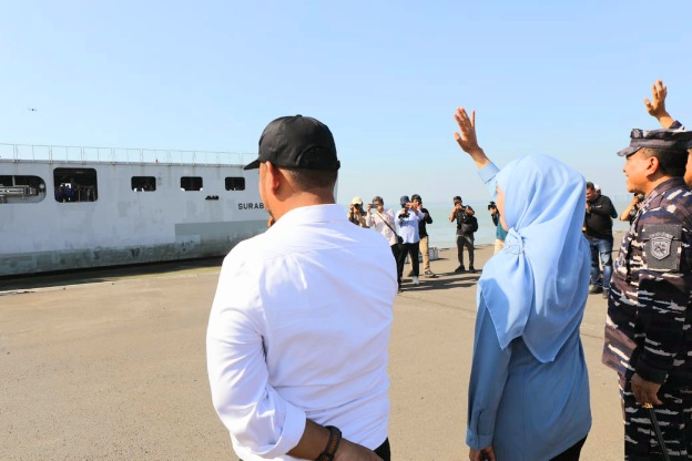 “Ini segera akan diberangkatkan KRI Surabaya 591. Kali ini akan membawa berbagai bantuan untuk saudara kita di Bawean,” ujar Gubernur Khofifah saat pelepasan bantuan.