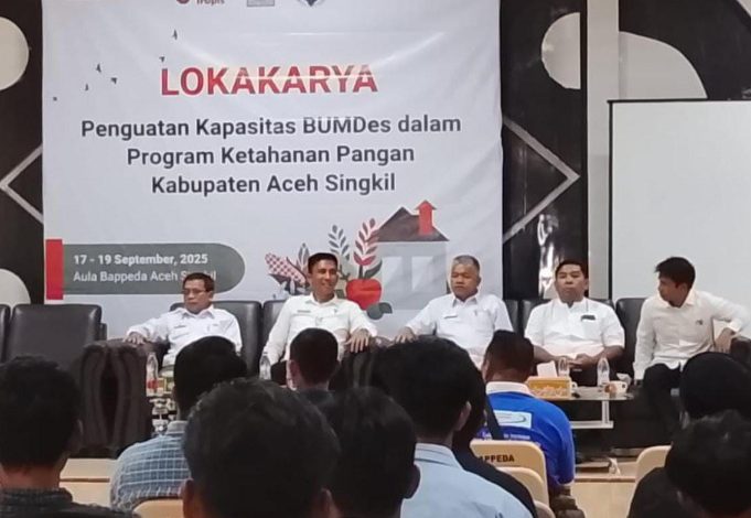 ACEH SINGKIL, BIDIKNASIONAL.com – Dinas Pemberdayaan Masyarakat Dan Kampung (DPMK) Aceh Singkil bersama mitra pembangunan menyelenggarakan Lokakarya Penguatan Kapasitas BUMDes dalam Program Ketahanan Pangan Kabupaten Aceh Singkil, kegiatan ini berlangsung pada 17–19 September 2025 di Aula Bappeda Aceh Singkil, Rabu (17/9-2025).