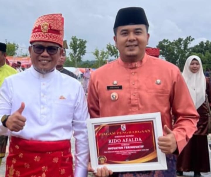 Penghargaan yang diterima oleh Ridho afalda S.STP.M.Si sebagai Inovator terinofatif di serahkan langsung oleh bupati kabupaten pelalwan H.zukri, pada saat bersamaan dengan HUT pelalawan ke 26.