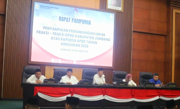 JOMBANG, BIDIKNASIONAL.com – Peraturan Daerah (Perda) tentang Anggaran Pendapatan dan Belanja Daerah (APBD) untuk tahun 2026. Perda ini mengatur pendapatan daerah, belanja daerah,dan pembiayaan daerah untuk tahun anggaran tahun 2026. Saatnya kini Dewan Perwakilan Rakyat Daerah (DPRD) Kabupaten Jombang kembali menggelar Rapat Paripurna penyampaian pandangan umum fraksi terhadap Raperda Anggaran Pendapatan dan Belanja Daerah (APBD) Tahun 2026 yang dipimpin Ketua DPRD Hadi Atmaji. Dihadiri Bupati dan Wabup Jombang, Wakil Ketua dan Anggota DPRD, Sekda, Perwakilan Forkopimda, Asisten, Staf Ahli, Kepala OPD, Pemimpin Bank Jatim, Direktur RSUD, Direktur BUMD, Kabag dan Camat. Bertempat di ruang Paripurna DPRD Kabupaten Jombang. Kamis (16/10/2025)