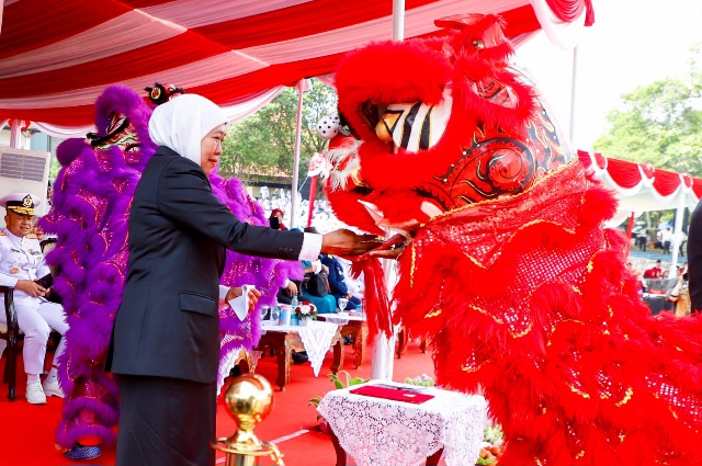 Gubernur Khofifah memberikan angpao kepada barongsai yang ikut memeriahkan hari sumpah pemuda (foto: istimewa)