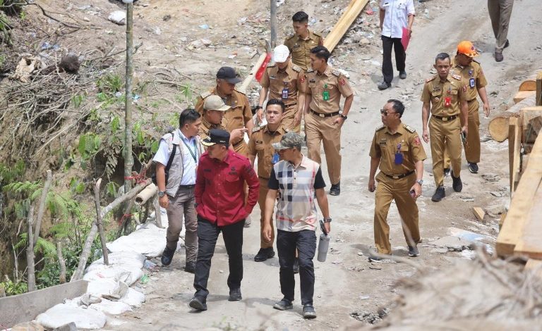Bupati Lampung Barat, Parosil Mabsus melakukan Inspeksi mendadak (sidak) ke lokasi jalan putus yang berlokasi di Lingkungan Seranggas Kelurahan Pasar Liwa, Senin (3/10/2025). Foto: doc. Diskominfo Lambar