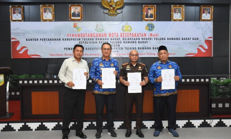 TUBABA, BIDIKNASIONAL.com – Pemerintah Kabupaten Tulang Bawang Barat (Tubaba) mengambil langkah tegas dan strategis untuk menyelesaikan masalah agraria yang telah menahun. Hari ini, Bupati Tubaba, Ir. Novriwan Jaya, S.P., memimpin penandatanganan Nota Kesepakatan (MoU) antara Pemkab Tubaba, Kantor Pertanahan, Kejaksaan Negeri, dan Kepolisian Resor setempat. Bertempat di Ruang Rapat Bupati, Senin (10/11/2025).
