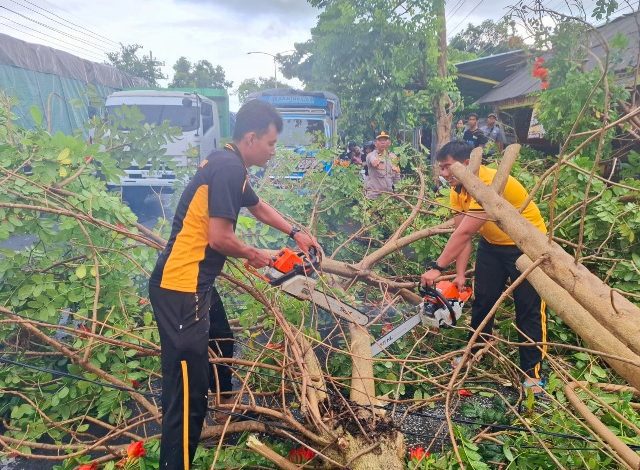 Selanjutnya, Kasat Samapta Kompol Basori Alwi dan Pamapta bersama personil Polresta Banyuwangi gerak cepat memotong pohon yang tumbang, menutup jalan serta mengatur arus lalu-lintas.