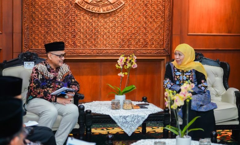 SURABAYA, BIDIKNASIONAL.com – Gubernur Jawa Timur Khofifah Indar Parawansa menerima Kunjungan Kerja Menteri Haji dan Umroh RI KH. M. Irfan Yusuf di Gedung Negara Grahadi, Surabaya, Minggu (16/11) malam.