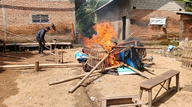 Di lokasi, petugas menemukan sejumlah sarana yang digunakan dalam perjudian sabung ayam tersebut. Beberapa barang bukti seperti arena sabung, karpet dasar, dan tujuh sangkar ayam langsung dimusnahkan di tempat.