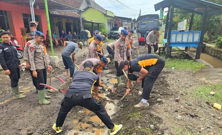 Personel gabungan melaksanakan kerja bakti membersihkan rumah warga dan jalan yang tertutup lumpur, sekaligus membagikan makanan kepada masyarakat.