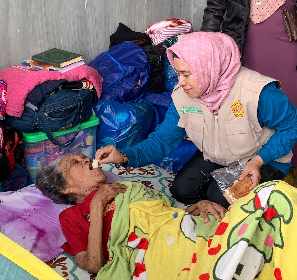 Prof Rika saat menyuapi seorang pengungsi nenek yang sakit (ist/BN)