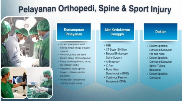 Layanan Bedah Orthopedi (Spine, Hip and Knee), Bedah Urologi, Bedah THT-KL, Bedah Thorak Cardio Vaskuler, Bedah Onkologi; 6.) Layanan Radiologi dan Diagnostik sebagai pemeriksaan penunjang, seperti CT scan, ABUS, MRI; 7.) Layanan Gigi Terpadu ; mulai perawatan gigi konservatif, bedah mulut, bedah orthodentis, Kesehatan gigi anak; 8.) Layanan Kesehatan Mental anak yang Terintegrasi dengan Rehabilitasi Medis, Pskiatri dan Psikolog;