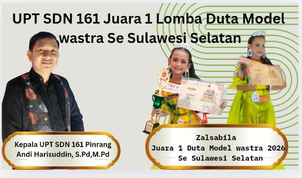 PINRANG, BIDIKNASIONAL.com – UPT SDN 161 Pinrang Raih Prestasi juara 1 lomba Duta Model Wastra Se Sulawesi Selatan Dan lolos ketingkat Nasional. Adalah Ananda Zalsabilah Suswi Hebat Di UPT SDN 161 Pinrang setelah menyabet juara 1 Vote terbanyak dan juara 1 Best Medsos terbanyak diacara dara daeng kembali Ananda meraih juara 1 tingkat provinsi SulSel.